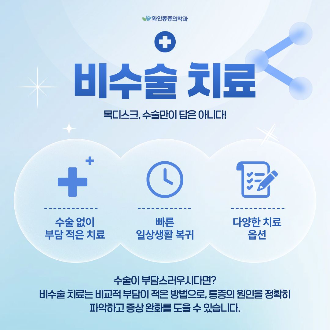 비수술 치료는 절개나 수술 없이 약물치료, 물리치료, 도수치료, 주사치료 등